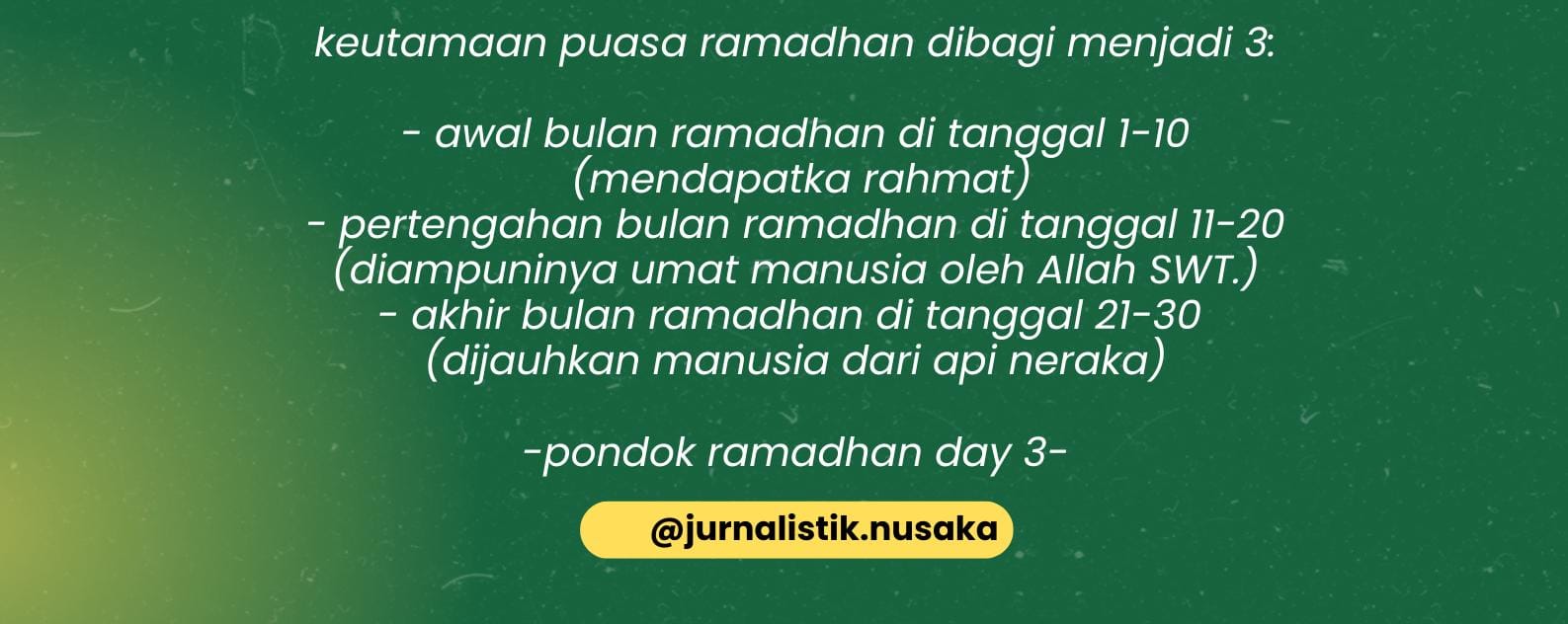 - Pertengahan Ramadan (11–20): Periode diampuninya umat manusia oleh Allah SWT.